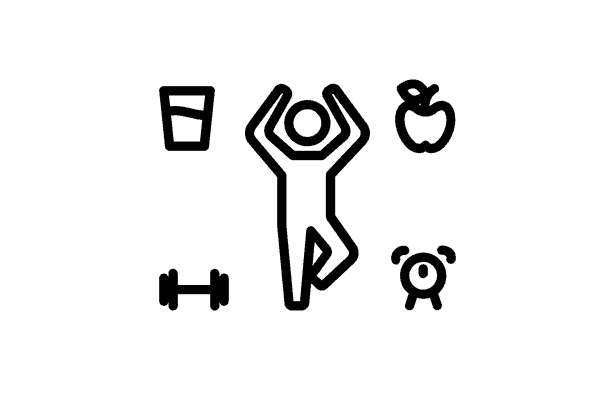 An icon shows a person stretching, surrounded by a weight, a glass of water, an apple, and an alarm clock - symbolising a healthy lifestyle