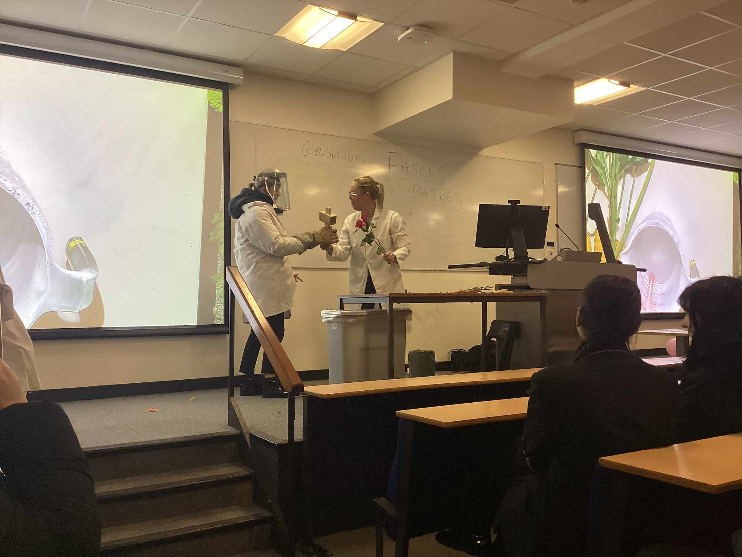 Some students even got up on stage to take part, smashing frozen rubber and flowers with a mallet!